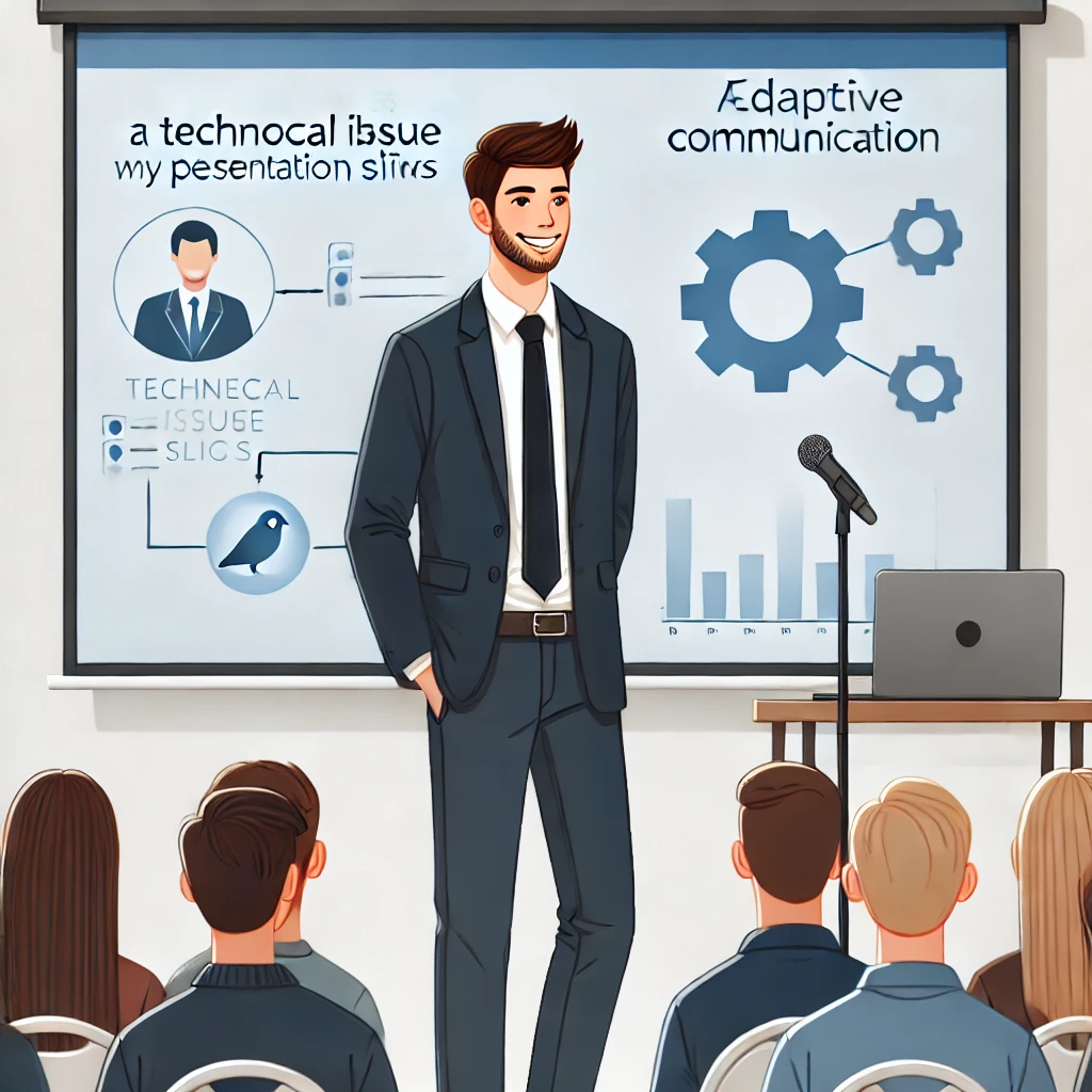 발표 중 기술적 문제가 발생할 수 있습니다. 예를 들어, 프로젝트가 작동하지 않거나, 마이크에 문제가 생길 수 있습니다. 이러한 상황에서는 침착하게 대체 방안을 실행하세요. 슬라이드 없이도 내용을 전달할 수 있도록 준비해 두는 것이 중요합니다.