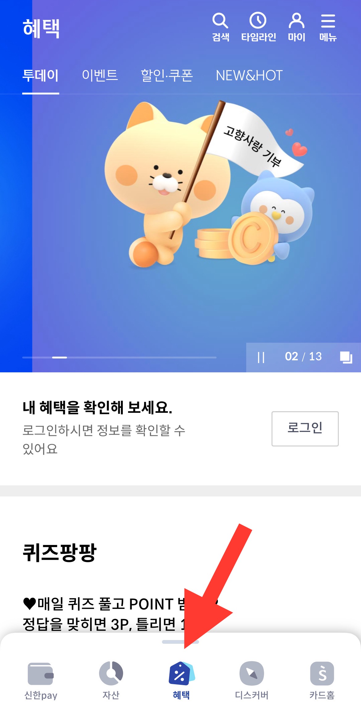로그인 후 신한SOL페이앱 아래 [혜택]을 눌러주세요.