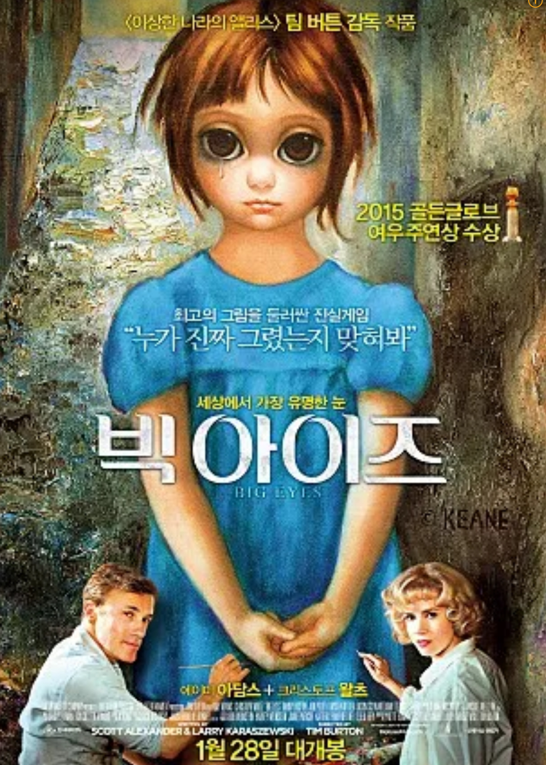 2014년 개봉한 영화 빅아이즈는 팀 버튼이 감독한 영화입니다. 영화에서 중추적인 역할을 한 주요 인물들을 소개합니다. 이야기의 중심에는 에이미 아담스가 있는데, 마거릿 킨으로 강렬한 연기를 선보입니다. 그녀의 묘사는 남성 중심의 예술 세계에서 인정과 정체성을 위한 예술가의 투쟁에 생기를 불어넣습니다. 아담스의 반대편에 있는 크리스토프 왈츠는 마거릿의 매력적이지만 논란이 많은 남편 월터 킨을 형상화하고 있으며, 그의 행동은 마거릿의 예술적 우수성에 그림자를 드리우고 있습니다. 영화는 등장인물들의 배경, 동기, 그리고 그들의 관계의 격동적인 역학에 대해 자세히 설명합니다. 1950년대의 활기찬 예술 장면부터 이어진 법정 싸움까지, 빅 아이즈는 예술의 실, 속임수, 그리고 개인적인 회복력으로 짜여진 태피스트리입니다. 화가 마가렛 킨의 실화를 다룬 영화입니다. 이 영화로 에이미 애덤스는 골든글로브상 뮤지컬코미디 부문 여우주연상을 수상합니다. 영화를 보신 분들은 기억하겠지만, 10년이 지났어도 영화가 개봉할 당시 포스터가 인상적입니다.