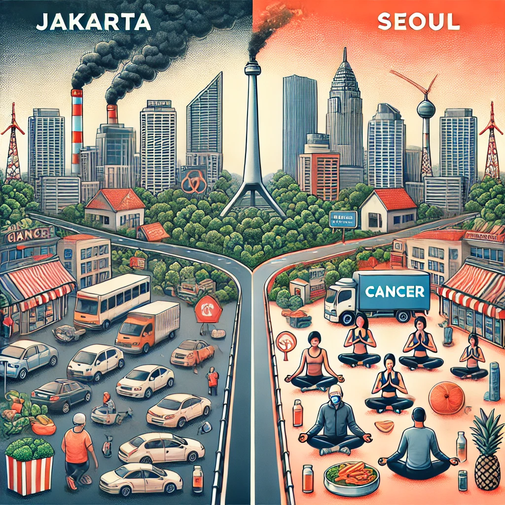 자카르타와 서울의 도시 환경이 암 발생에 미치는 주요 요인은 다음과 같습니다.