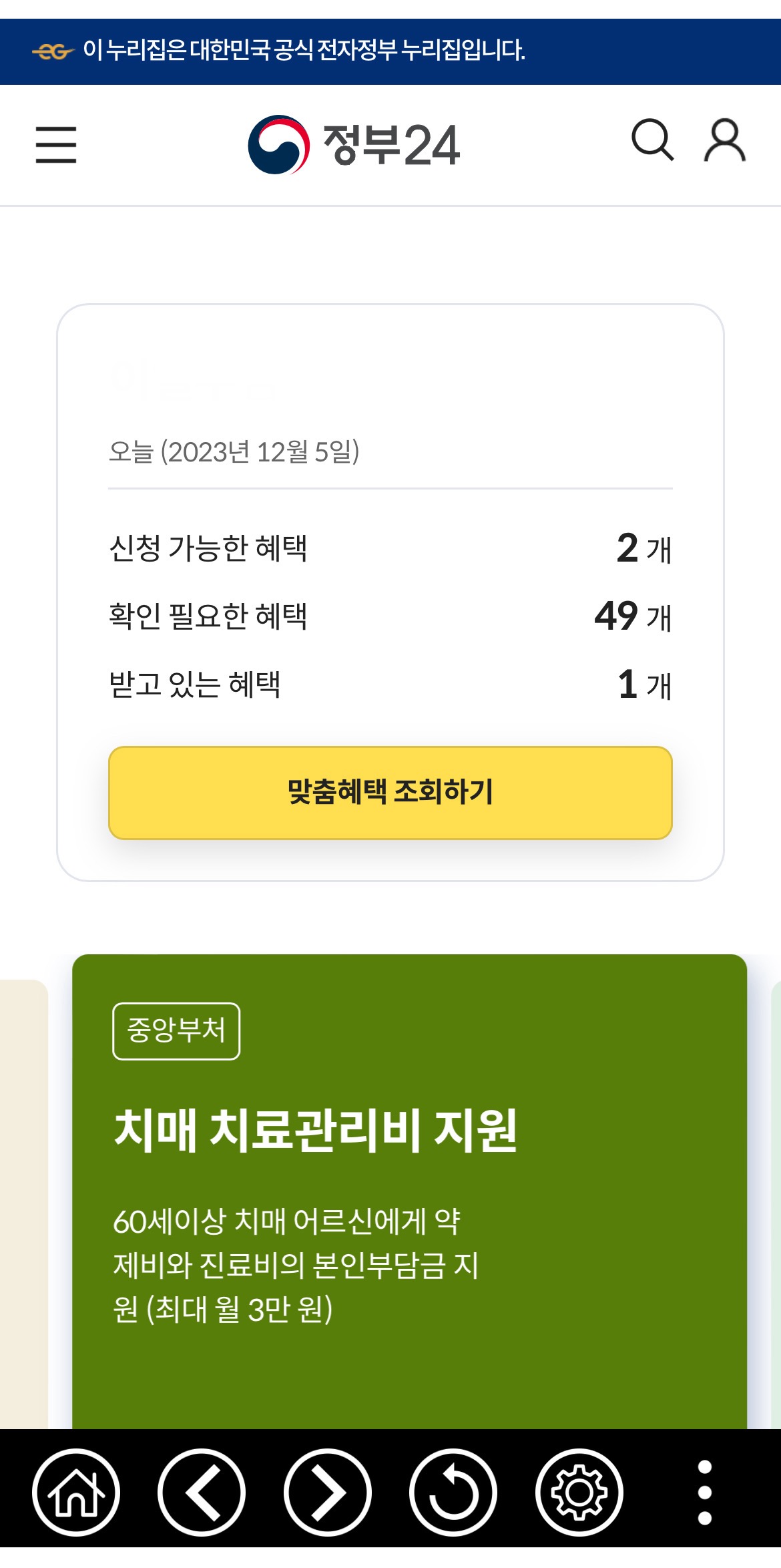 정부24 어플 다운 - 로그인 - 마이페이지 - [맞춤 안내 조회]