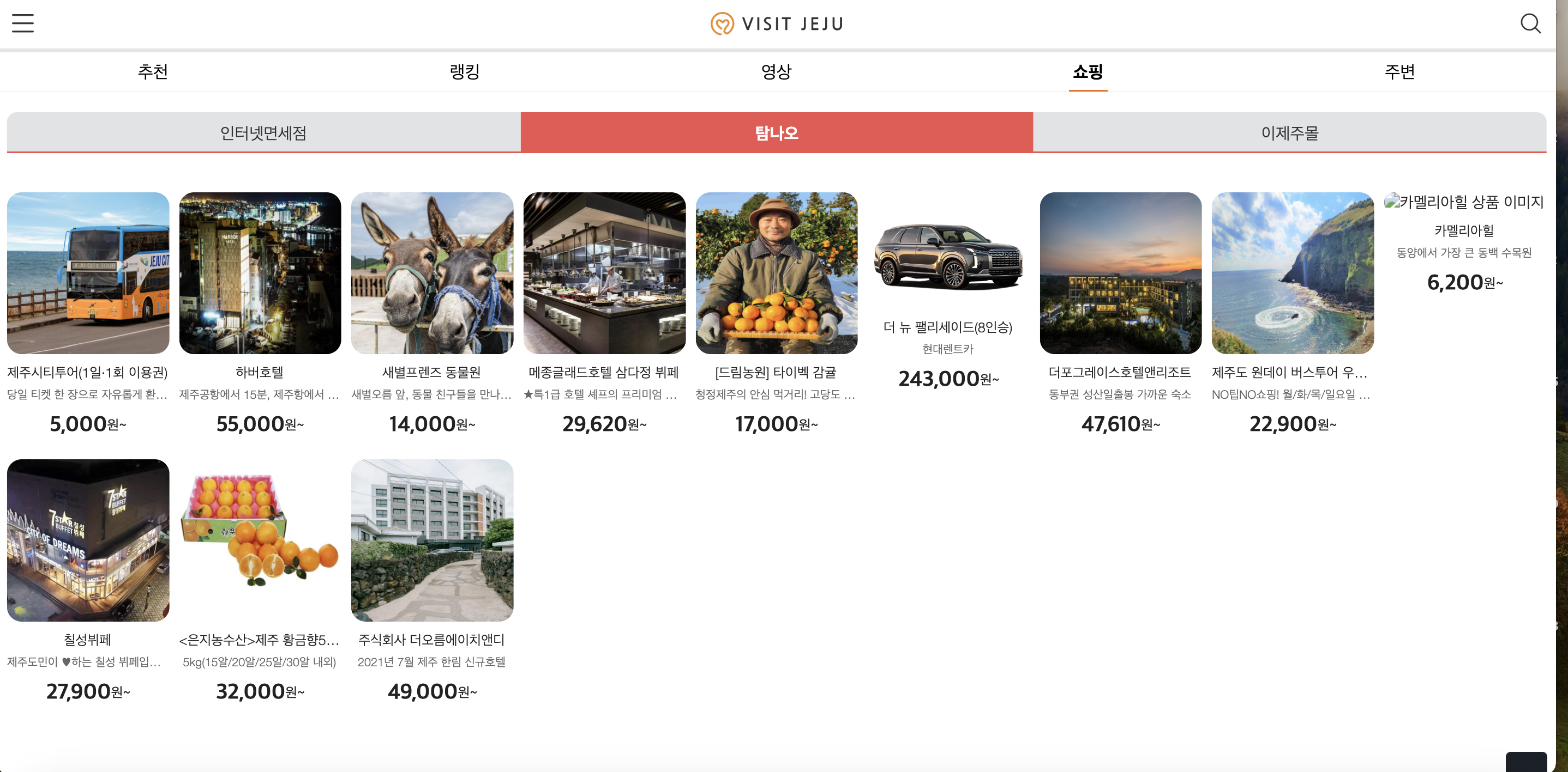 쇼핑 항목에서는 인터넷 면세점, 탐나오, 이제주몰의 상품들이 등록되어 있습니다.