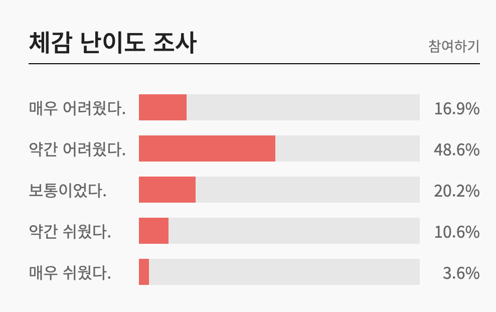 고1 학생들은 매우 어려움 16.9% , 약간 어려움 48.6% , 보통 20.0%, 약간 쉬움 10.6%, 매우 쉬움 3.6% 로 약간 어려웠다는 응답이 제일 많았습니다.